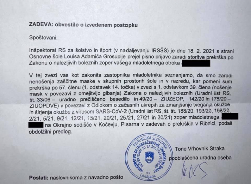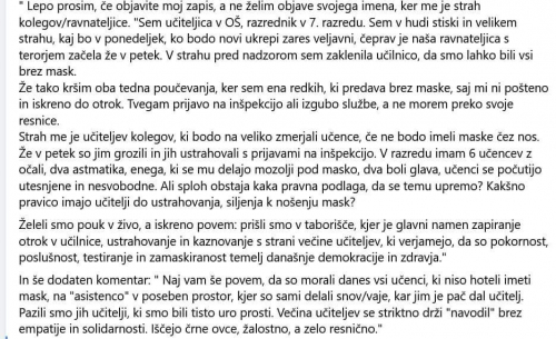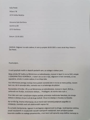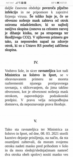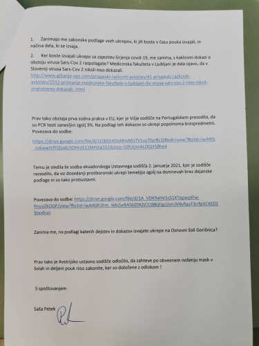 Na vprašanja glede smiselnosti nedavnega ukrepa obveznega nošenja mask za otroke od 6.razreda OŠ do 4.letnika SŠ, starši odgovora s strani odgovornih še nismo prejeli (vprašanja bom še enkrat priložila na koncu tega sporočila). Pa bi morali biti odgovori, po enem letu pridobivanja izkušenj glede obvladovanja aktualnega virusa, odgovornim, ki so se za ukrep odločili, zelo jasni, saj so vprašanja samoumevna.