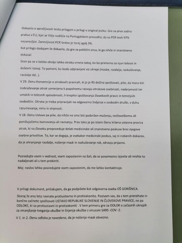 Poleg vseh ukrepov, ki so v zadnjem letu prizadeli naše otroke, pa naj bi se zdaj pripravljalo še obvezno testiranje otrok. Ker konkretnih navodil in razpoložljivih možnosti za nadaljevanje šolanja za otroke, katerih starši tega posega v telo svojega otroka ne bomo dopustili, v primeru takega ukrepa s strani odgovornih seveda še ni, vam pišem že sedaj, da bo naša nadaljnja skupna pot lahko čimbolj učinkovita, ustrezna in za vse z vseh vidikov (tudi pravnega) pravilna.