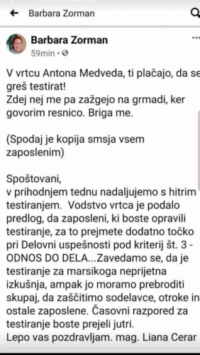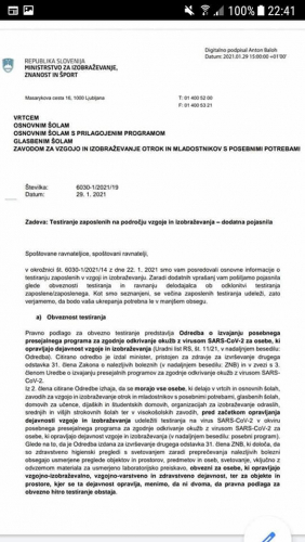 Prav tako je nedopustno, da se odgovornost za ukrepanje zoper tiste, ki bodo zavrnili testiranje, prenaša na ravnatelje. V okrožnici OSNOVNIM ŠOLAM S PRILAGOJENIM PROGRAMOM ZAVODOM ZA VZGOJO IN IZOBRAŽEVANJE OTROK IN MLADOSTNIKOV S POSEBNIMI POTREBAMI OSNOVNIM ŠOLAM Z ODDELKI PRILAGOJENEGA PROGRAMA SOCIALNO-VARSTVENIM ZAVODOM, ki jo je izdalo MIZŠ z dne, 29. 12. 2020, s strani direktorja direktorata za predšolsko vzgojo in osnovno šolo Antona Baloha, je zapisano, da je želeno, da se vsi zaposleni v šolah in zavodih testirajo na okužbo s SARS CoV-2. Pričakujemo, da bo testiranje ostalo neobvezno za vse zaposlene v VIZ.