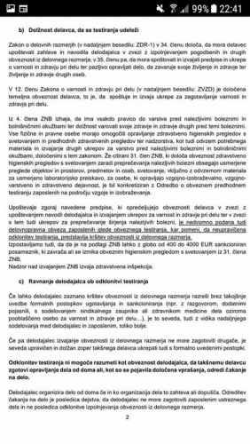 Obveščamo vas, da se s tem številni zaposleni v VIZ ne strinjamo.Obvezno testiranje ne sme in ne more biti pogoj za opravljanje delovnih obveznosti v VIZ brez jasnih epidemioloških in pravnih razlag, da je ta ukrep nujen in v odnosu z drugimi ukrepi za zajezitev širjenja okužb v državi tudi sorazmeren. Zahtevanje in pogojevanje testiranja za zaposlene v VIZ ne omogoča enakosti varovanja ter sistemskega ukrepanja pred širjenjem okužbe s COVID-19 in nas skrbi, da bo ta ukrep prekomeren, celo neustaven za zaposlene in ostale deležnike v VIZ.