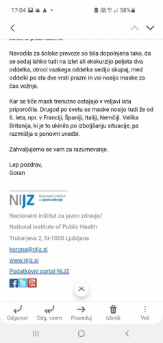 oprostite MIZŠ, ampak vi ste VIZ-jem pošiljali že nešteto predpisov, o tem, kaj je potrebno v šolah in vrtcih narediti, med katerimi seveda so tudi takšni, ki predpisujejo zaščitna sredstva in preventivne ukrepe - za katere sedaj pišete, da niste pristojni - ergo, zakaj ste jih pošiljali? torej jih preklicujete ali kako? ali si pilatovsko perete roke ali kako? torej vaši dopisi NISO VELJAVNI ali kako? torej je NOŠENJE MASK V ŠOLAH - invalidni predpis - neveljavni ukrep, ki ste ga do danes vsiljevali, do danes, ko sem jaz prejel ta vaš dopis