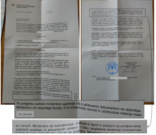iz ministrstva sem prejel odgovor na mojo prošnjo, da mi pokažejo znanstvene študije o VARNOSTI IN UČINKOVITOSTI NOŠENJA MASK PRI OTROCIH. takšno je bilo predpisano navodilo, ki so ga ravnateljicam in ravnateljem poslali z MIZŠ-ja - da morajo otroci pri pouku nositi maske. ker nisem strokovnjak na področju zdravja, epidemij in mikrobiologije, sem kot starš zahteval znanstveno utemeljitev o predpisanem ukrepu - da se kot starš lažje in bolj informirano odločim o tem, ali dovoljujem ta zaščitni medicinski poseg na mojih otrocih