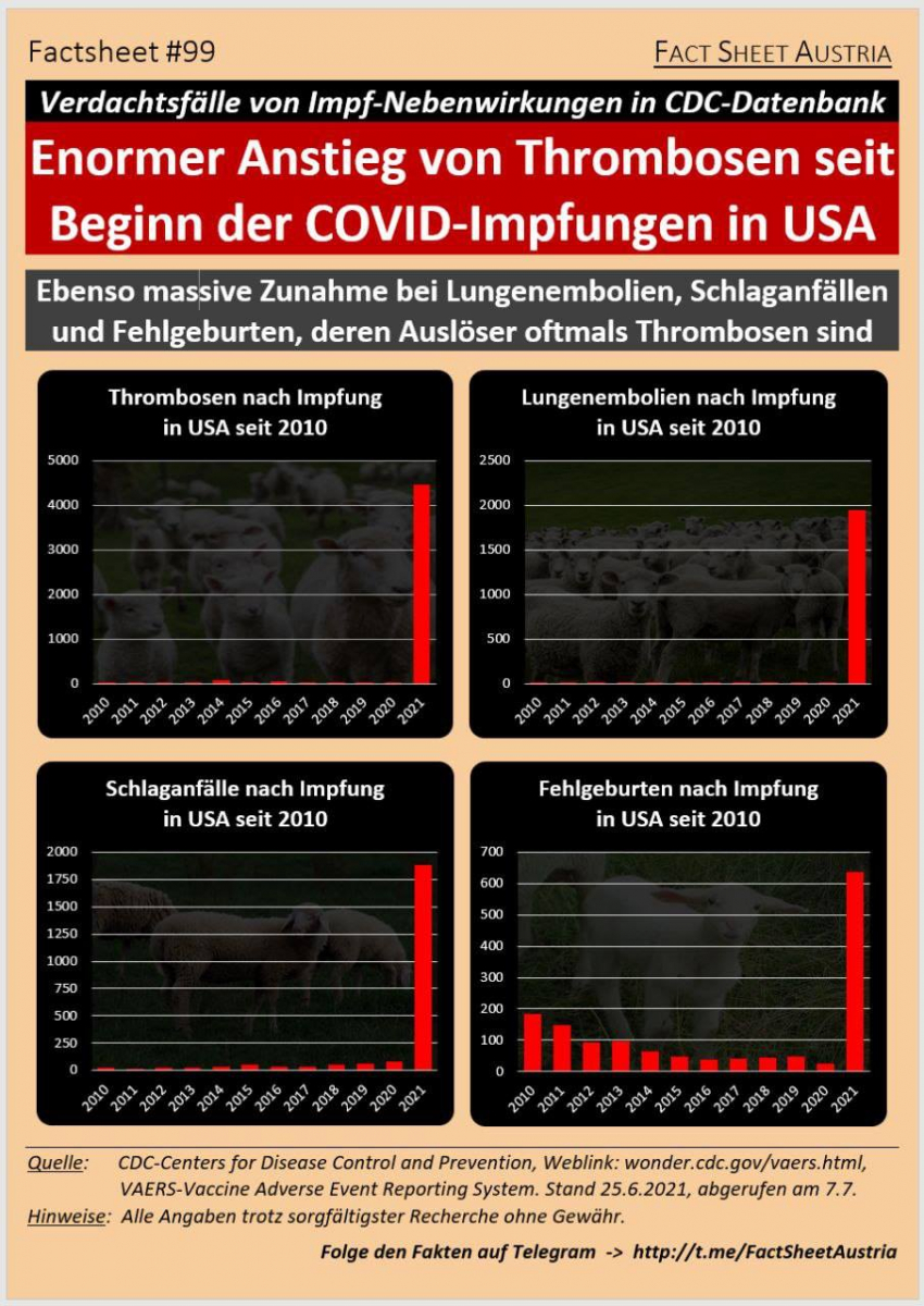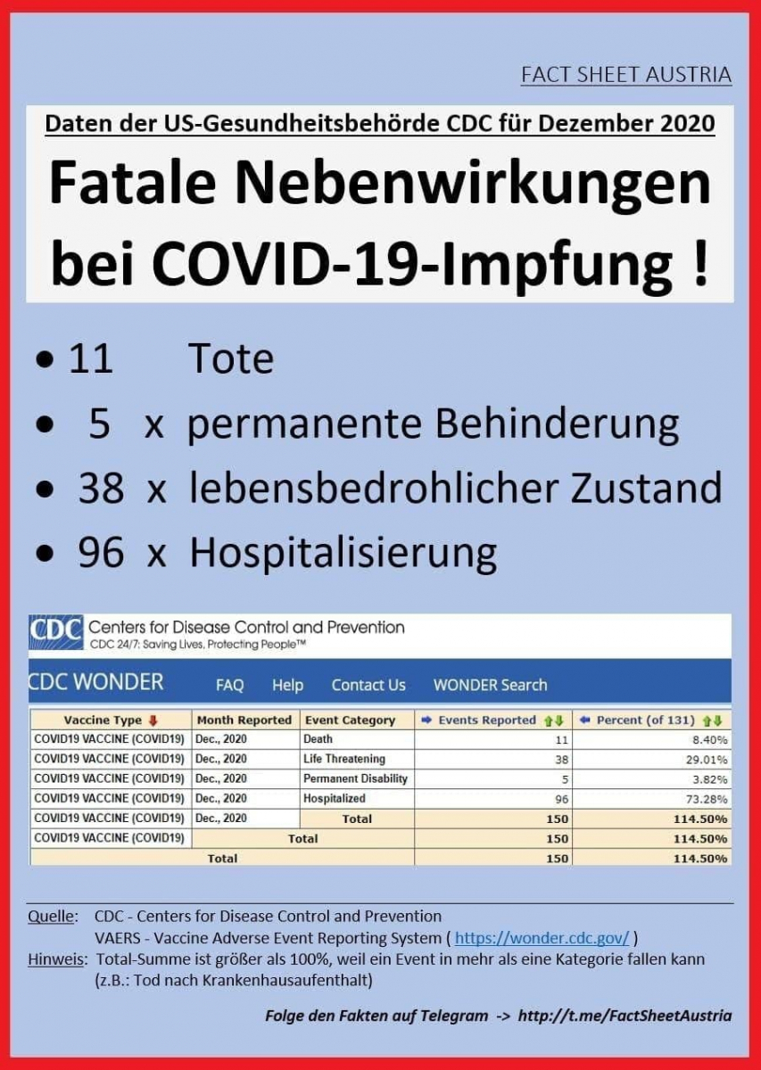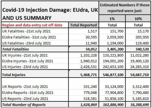 Novejši podatki kažejo celo 501 smrti in 10.748 poškodb do 29.1. 2021. Teh smrti in poškodb je v resnici verjetno še več, saj je znano, da je VAERS statistika v pretekolosti zabeležila le 1% dejanskih smrti in neželenih stranskih učinkov cepiv.