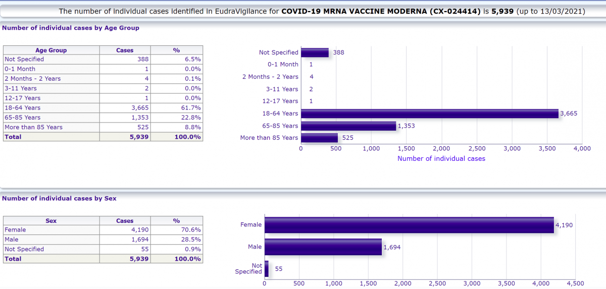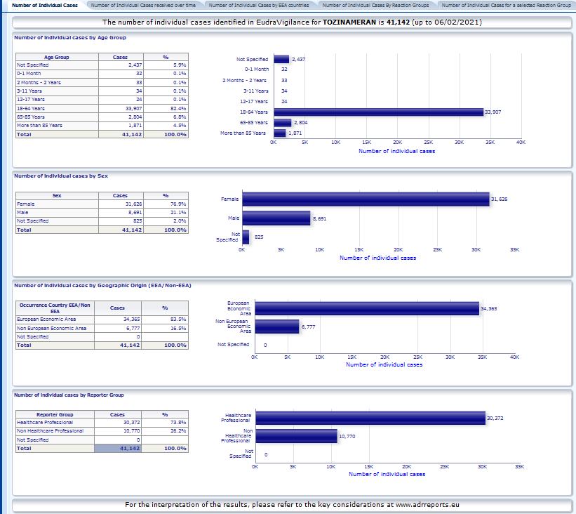Gregor Kos FB 6.2. 2021: "Skupaj že 41.142 prijavljenih neželenih učinkov cepiva Pfizer EU agenciji EMA. (do.4.2. 2021) V 76,9% gre za ženske in v 73,8% za ZDRAVSTVENE DELAVCE !!!"