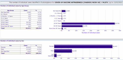 As of 14 March 2021, for the UK, 38,084 Yellow Cards have been reported for the Pfizer/BioNTech, 78,223 have been reported for the Oxford University/AstraZeneca vaccine, and 325 have been reported where the brand of the vaccine was not specified.