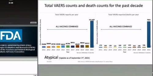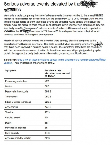 The data we just cited come from the Vaccine Adverse Events Reporting System (VAERS) which is managed by the CDC and the FDA. VARES has received a lot of criticism over the years, some of it founded. Some critics have argued for a long time that VARES undercounts vaccine injuries. A report submitted to the Department of Health and Human Services in 2010 concluded that “fewer than 1% of vaccine adverse events are reported” by the VARES system. Fewer than 1%. So what is the real number of people who apparently have been killed or injured by the vaccine? Well, we don’t know that number. Nobody does, and we’re not going to speculate about it. But it’s clear that what is happening now, for whatever reason, is not even close to normal. It’s not even close to what we’ve seen in previous years with previous vaccines.