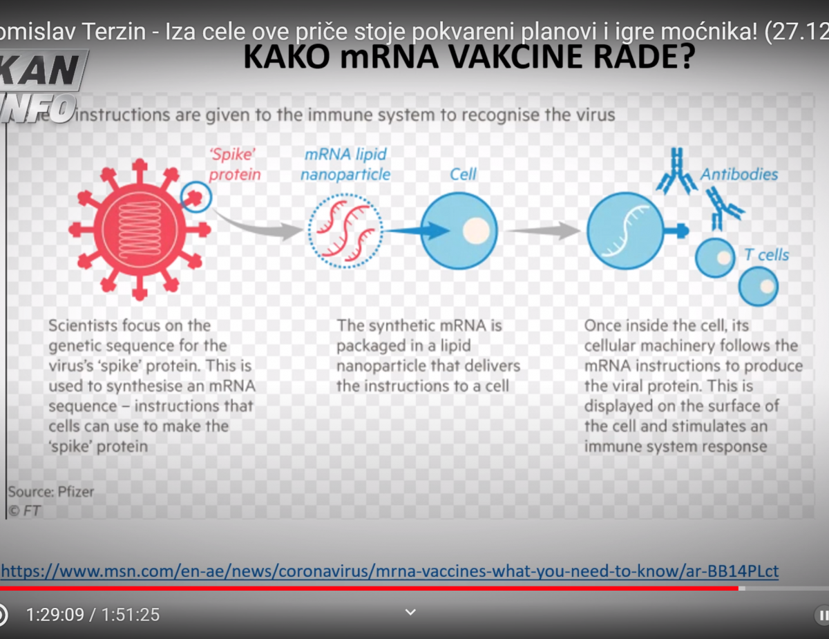 Pfizer mRNA cepivo je nova tehnologija, ki ima umetno narejeno genetsko informacijo za virusno spike beljakovinsko bodico, kar dajo v lipidne nanodelce. Ali bo ta nanodelec ostal v celični citoplazmi, ali pa bo šel tudi v jedro celice- to ni znano. Ta beljakovinska bodica bo narejena v celici in šla bo na zunanjo površino membrane celice, kjer jo bo imunski sistem prepoznal in napadel. Če bi bilo to varno, bi bila to inovacija na področju cepiv, pravi dr. Terzin, ki ni nasprotnik cepljenja.