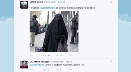 Poslanka SMC Jasna Murgel je na tviterju zagrozila kolumnistu Reporterja Vinku Vasletu, da »se vidita na sodišču«, ker ji je »prilepil« burko. Pa menda ni versko nestrpna?