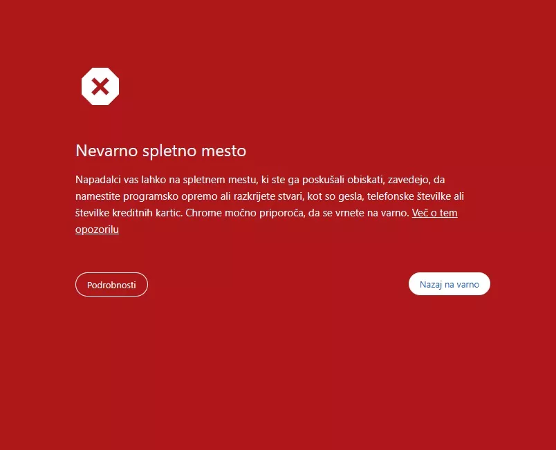 Google je v spletni brskalnik nastavil funkcijo lažnih strani. Celotna stran se pojavi uporabnikom v rdeči grozeči barvi.