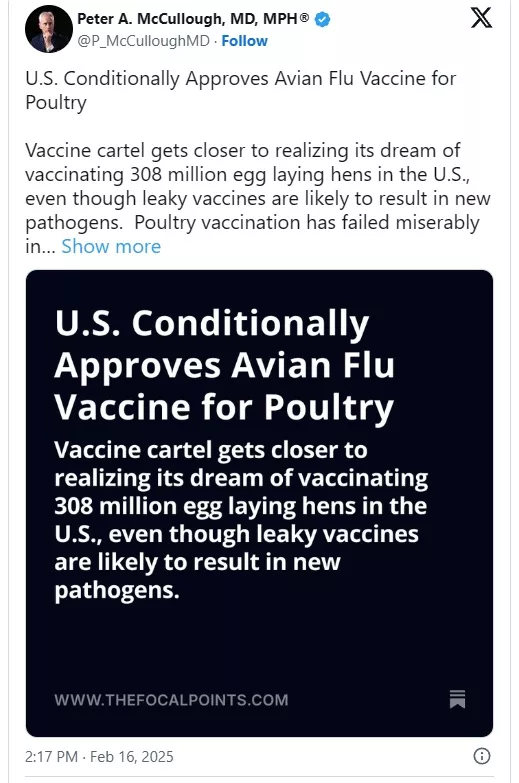 Več vodilnih strokovnjakov opozarja na resna tveganja, potem ko je Ministrstvo za kmetijstvo ZDA (USDA) odobrilo "pasivno" cepivo proti ptičji gripi za perutnino v preskrbi s hrano v ZDA.