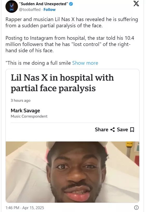 Reper Lil Nas X je osupnil obožce, ko je razkril Bellovo diagnozo paralize in povezal nenadno paralizo obraza z njegovim nedavnim cepivom mRNA. Glasbenik je delil svoje stanje iz bolniške postelje in opisal izgubo nadzora nad desno stranjo svojega obraza.