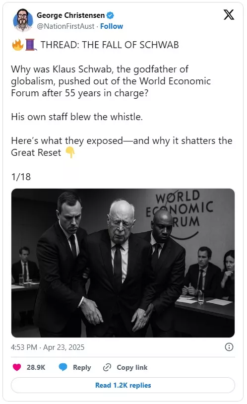 21. aprila 2025 je Klaus Schwab, ki je Svetovni gospodarski forum, ki ga je ustanovil, vodil 55 let, nepričakovano odstopil s položaja predsednika. Odstop je prišel nenadoma, brez besede zahvale ali slovesnosti.