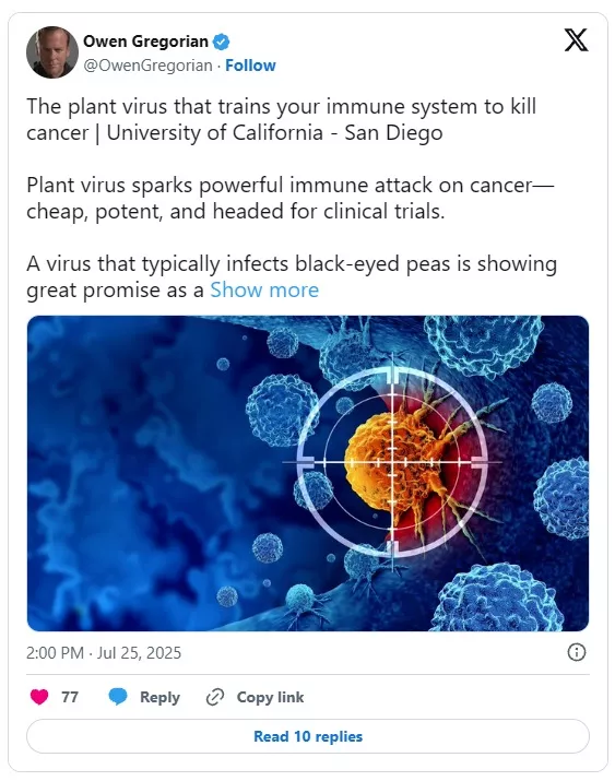 V svoji študiji z naslovom » Primerjalne analize za razvoj rastlinskih zdravil za imunoterapijo raka «, objavljeni v reviji Cell Biomaterials, so raziskovalci z Univerze v Kaliforniji v San Diegu objavili nekaj zelo zanimivih raziskovalnih podatkov. Kemiki in nanoznanstveniki so preuči, kako virus mozaika kravjega graha (CPMV) spodbuja človeški imunski sistem na način, kot ga drugi rastlinski virusi ne. Za razliko od drugih takšnih virusov se zdi, da ta virus sproži imunske odzive za boj proti raku.