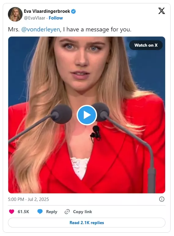 Spomnimo se, da je nizozemska politična komentatorka Eva Vlaardingerbroek na 'CPAC Hungary 2025' ponovno ostro kritizirala predsednico Evropske komisije Ursulo von der Leyen, jo obtožila skrajne neodgovornosti do državljanov EU in jo opozorila, da ji izteka politična imuniteta.