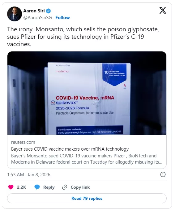 Po navedbah Bayerja so proizvajalci kontroverznih cepiv proti Covidu uporabljali tehnologijo, ki jo je Monsanto razvil in patentiral v osemdesetih letih prejšnjega stoletja. Tožena sta zdaj Pfizer in Moderna. Ločeno je tožena tudi družba Johnson and Johnson.