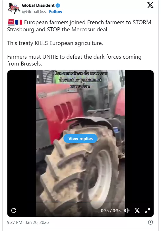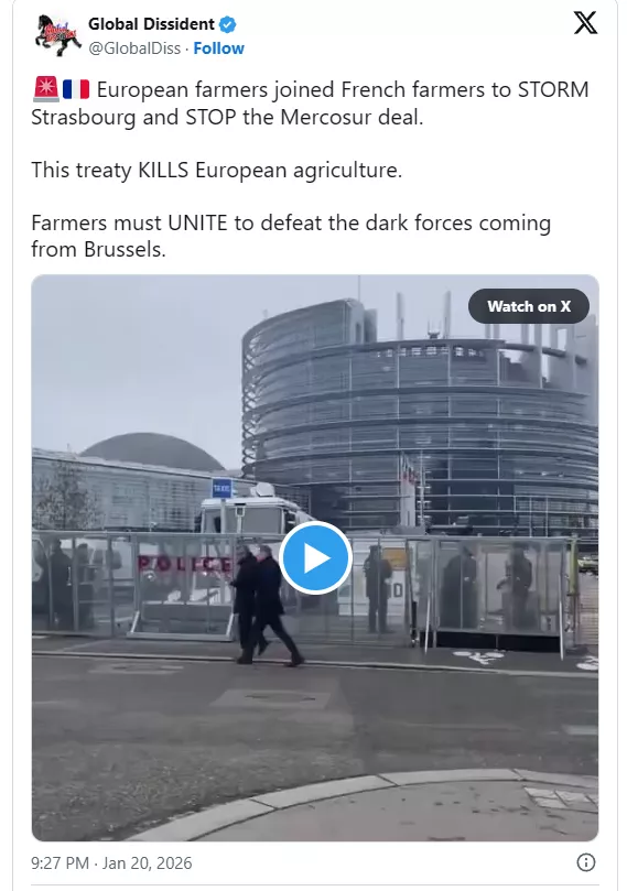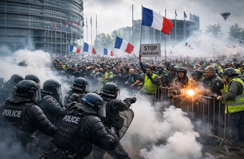 Med protestom kmetov v Strasbourgu pred glasovanjem Evropskega parlamenta o trgovinskem sporazumu Mercosurja je policija proti protestnikom, ki so zahti poziv k blokiranju sporazuma, uporabila solzivec. Policija je bila domnevno prisiljena vreči šokerje, ko so protestniki poskušali vstopiti v stavbo parlamenta.