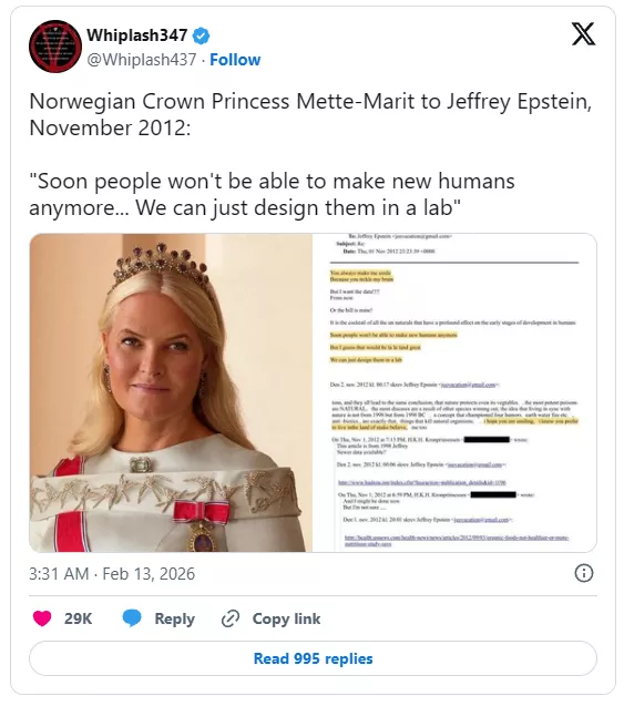 V najnovejšem poročilu o dosjejih Epstein iz leta 2026, ki ga je objavilo ameriško ministrstvo za pravosodje, je bila norveška prestolonaslednica Mette-Marit razkrita kot ključna osebnost v senčni orbiti Jeffreyja Epsteina, ki je spremljal in slavil napredek pri kloniranju in vzreji otrok v laboratorijih.