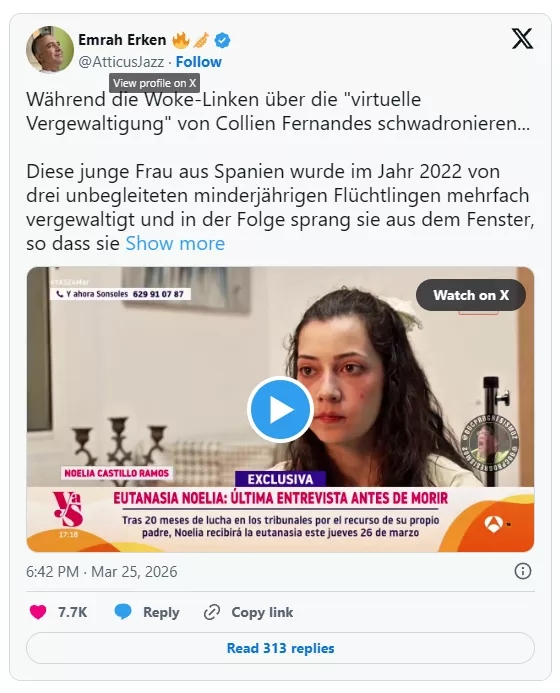 Medtem ko na primer v Nemčiji levičarske nevladne organizacije in glavni mediji zbirajo podporo za popoln nadzor nad internetom pod krinko »digitalnega spolnega nasilja«, Španija pod vodstvom Pedra Sáncheza dela naslednji korak. Tam država trenutno ubija mlado dekle, žrtev, ki jo je država prej zavrnila zaščito pred nasiljem, ki so ga zagrešili prosilci za azil.