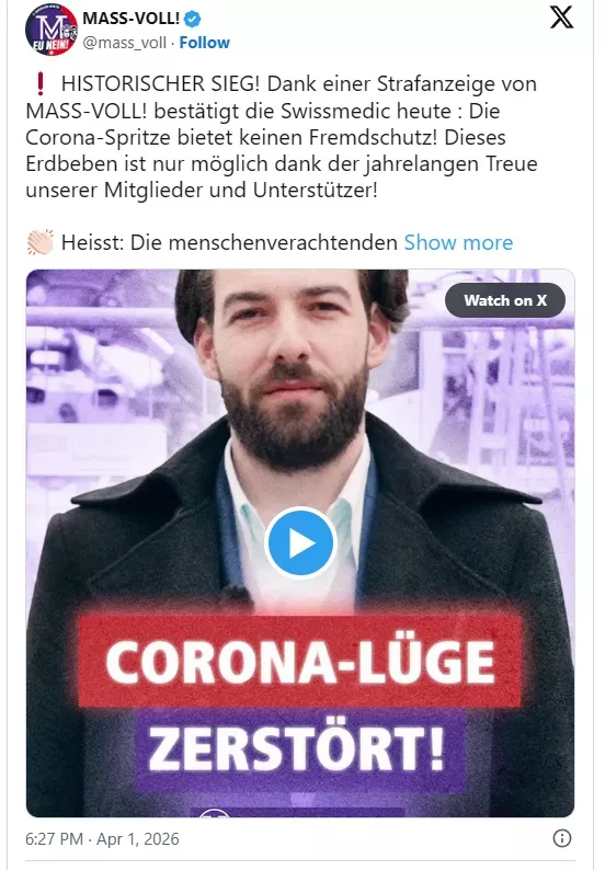 Ozadje tega poročila je kazenska ovadba, ki jo je vložila organizacija: odvetnik Artur Terekhov je v imenu »Mass-voll!« vložil pritožbo proti dvema lekarniškima verigama (Coop Vitality AG in Galenicare Management AG / Amavita) zaradi zavajajočega oglaševanja zdravil. Do lanske jeseni sta podjetji promovirali cepljenje s sloganom »Zaščitite sebe in druge«.