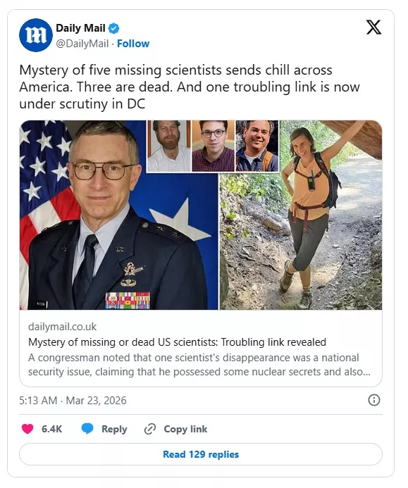 V Združenih državah Amerike je več znanstvenikov, ki so delali na pomembnih, tajnih projektih, bodisi izginilo brez sledu bodisi umrlo v skrivnostnih okoliščinah. Medtem ko ameriški kongresnik Tim Burchett javno izjavlja , da bi bilo treba to preiskati, nekdanji namestnik direktorja FBI-ja Chris Swecker gre še korak dlje in v zgodbo vplete tuje obveščne agencije. Zanimiva ideja – a le ena od mnogih. Ker pravi problem leži globlje: zdi se, da nikogar zares ne zanima, da bi ustrezno preiskal povezave.