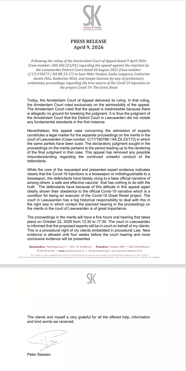 Prizivno sodišče v Amsterdamu je zavrglo pritožbo v zadevi glede cepiv proti Covidu-19 kot nedopustno, kar je preprečilo vsebinsko presojo obtožb. Sodišče se je osredotočilo zgolj na postopkovna vprašanja in potrdilo odločitev nižjega sodišča, ne da bi preučilo vsebino zadeve.