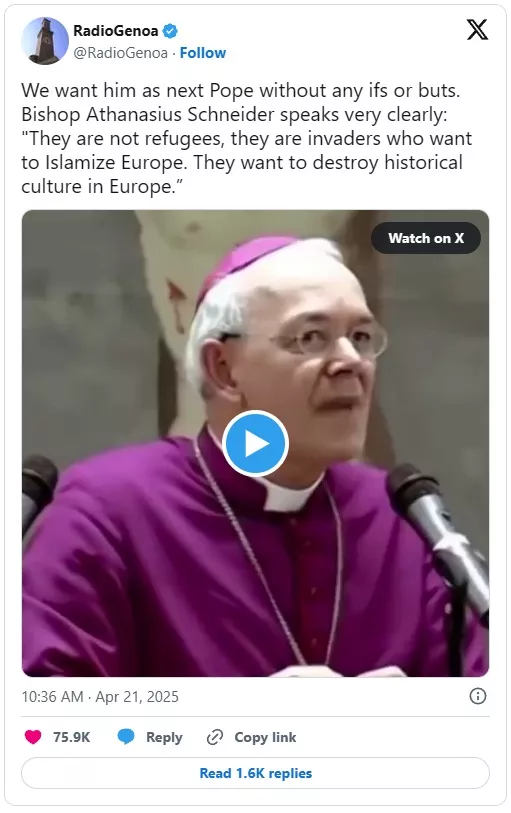 We want him as next Pope without any ifs or buts. Bishop Athanasius Schneider speaks very clearly: "They are not refugees, they are invaders who want to Islamize Europe. They want to destroy historical culture in Europe.”