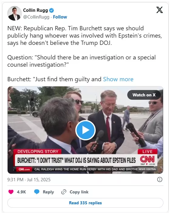 Republican Rep. Tim Burchett says we should publicly hang whoever was involved with Epstein's crimes, says he doesn't believe the Trump DOJ.