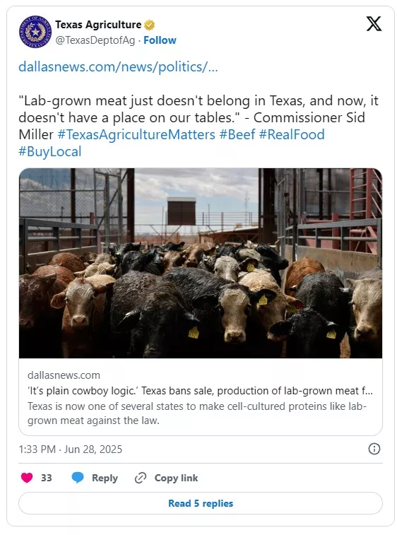 Texas has officially outlawed the sale and production of lab-grown meat this week, becoming the latest state to push back against “cell-cultured protein” in defense of the cattle industry.