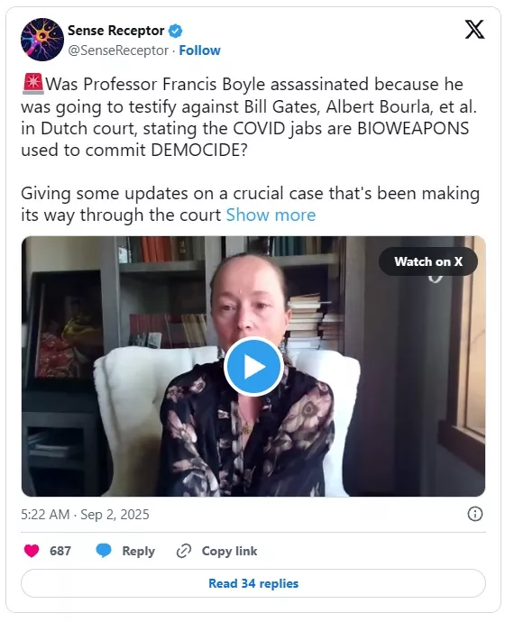 as Professor Francis Boyle assassinated because he was going to testify against Bill Gates, Albert Bourla, et al. in Dutch court, stating the COVID jabs are BIOWEAPONS used to commit DEMOCIDE?