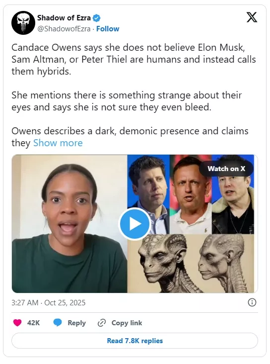 Candace Owens says she does not believe Elon Musk, Sam Altman, or Peter Thiel are humans and instead calls them hybrids.