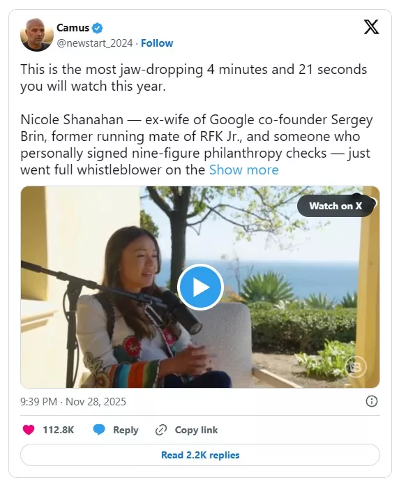 Nicole Shanahan — ex-wife of Google co-founder Sergey Brin, former running mate of RFK Jr., and someone who personally signed nine-figure philanthropy checks — just went full whistleblower on the entire Silicon Valley tech wife mafia” and how they were used.