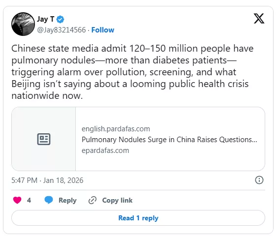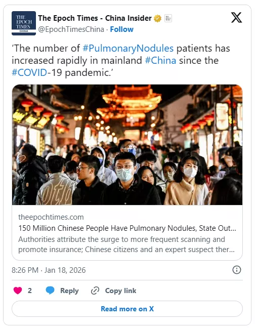 Chinese state media admit 120–150 million people have pulmonary nodules—more than diabetes patients—triggering alarm over pollution, screening, and what Beijing isn’t saying about a looming public health crisis nationwide now.