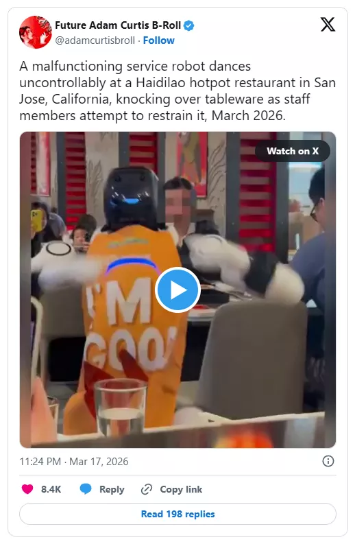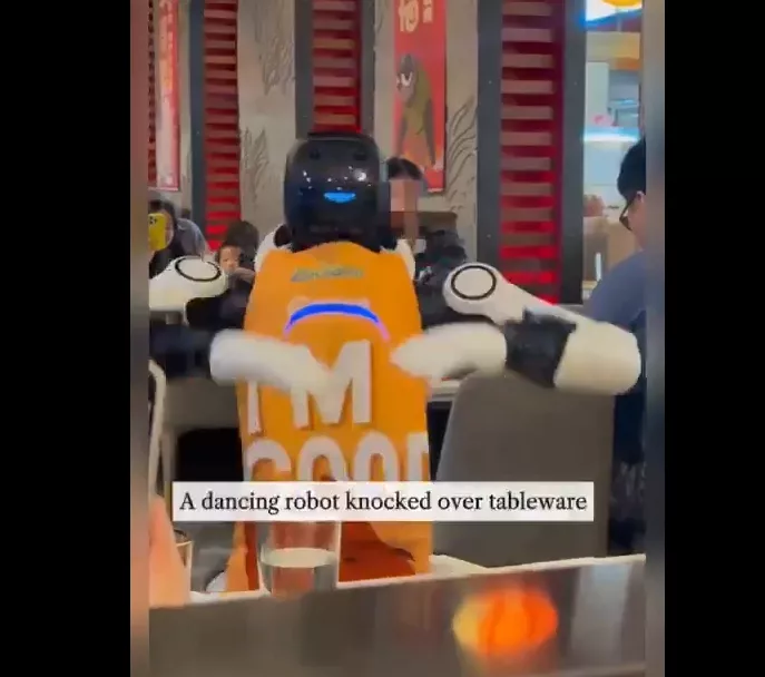 A malfunctioning service robot dances uncontrollably at a Haidilao hotpot restaurant in San Jose, California, knocking over tableware as staff members attempt to restrain it, March 2026.