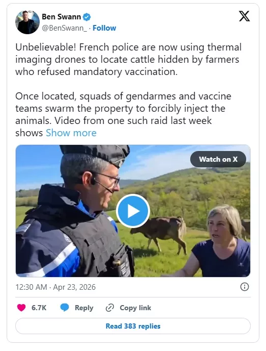 Unbelievable! French police are now using thermal imaging drones to locate cattle hidden by farmers who refused mandatory vaccination.