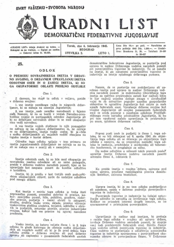 2. ODLOK O PREHODU SOVRAŽNIKOVEGA PREMOŽENJA V DRŽAVNO SVOJINO, ....u. l. Demokraticne Federativne Jugoslavije, Torek, dne 6. februarja 1945