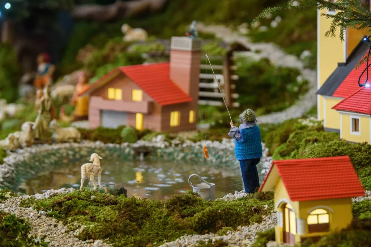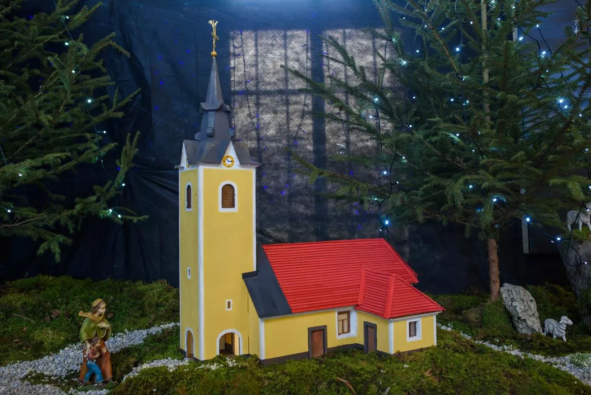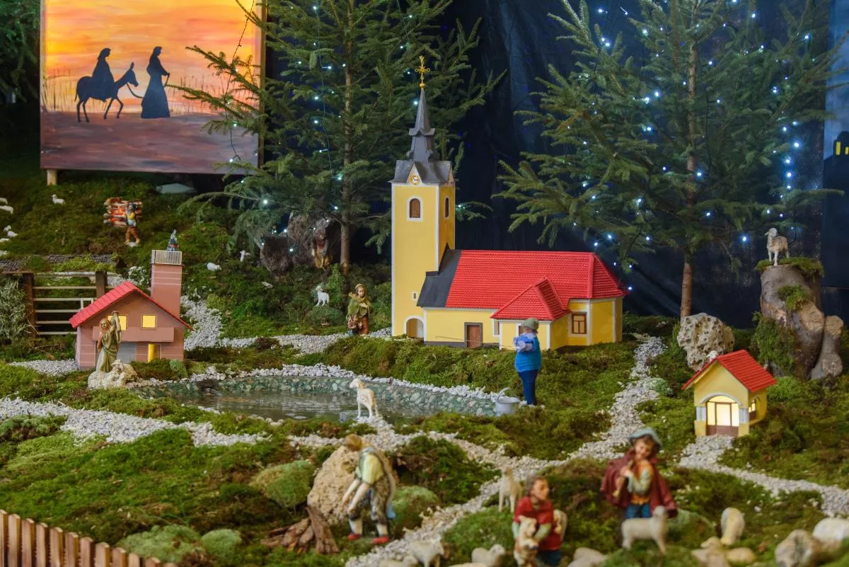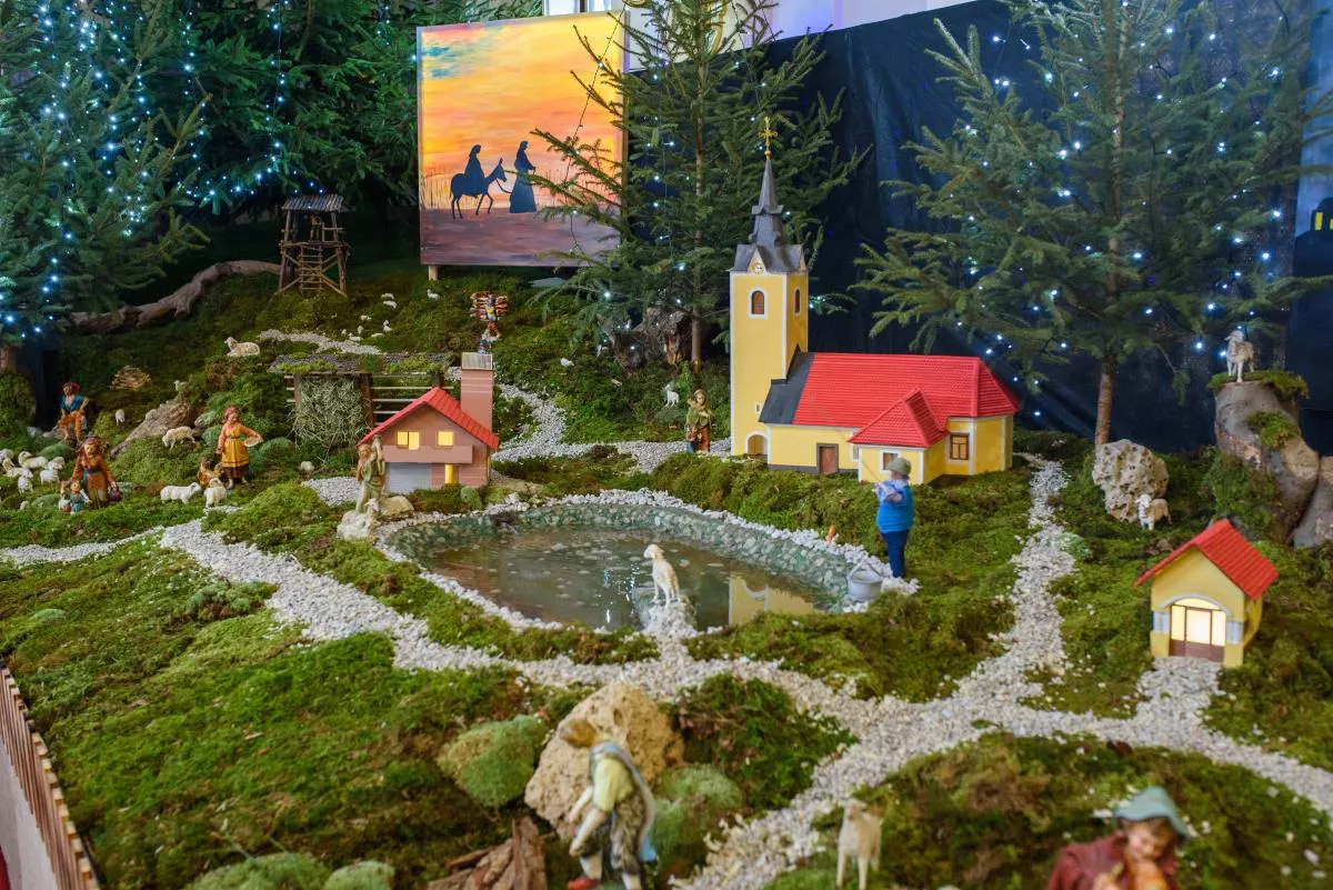 Posebnost letošnjih jaslic v Šentvidu je, da je v njih predstavljena vas Hrastov Dol z vaško lužo, gasilskim domom, vaško kapelico in nekdanjo staro šolo.