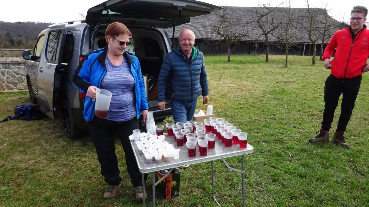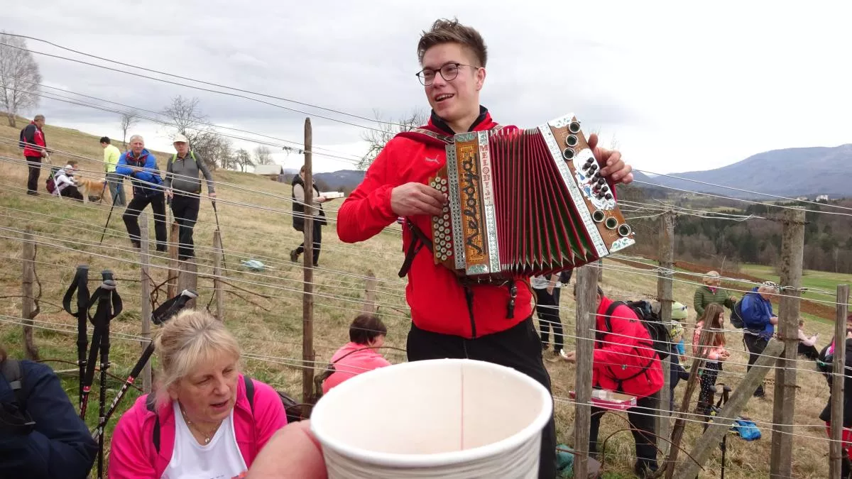 Pri cerkvi v Arčelci je bil še posebej lep in sladek sprejem, saj sta nas pričakala dva najmlajša pohodnika z sladkimi bomboni. Sledila je pogostitev, tudi za žejne je bilo poskrbljeno. Po travnikih in gozdovih nas je vodila pot do vinske gorice Brinova gora po domače Brinovke. Cilj je bil med vinogradi v zidanici pri Lovretovih iz vasi Reber, kjer so nas sprejeli ob zvokih harmonike ter nas bogato pogostili. Seveda pa v zidanici brez pokušine vin ne gre. Gostitelj Štefan je to nalogo opravil z odliko.