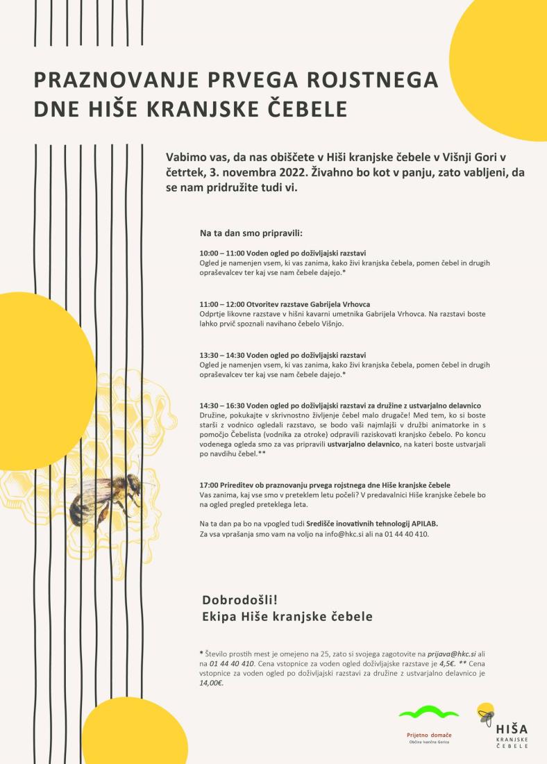 Vabimo vas, da nas obiščete v Hiši kranjske čebele v Višnji Gori v četrtek, 3. novembra 2022. Živahno bo kot v panju, zato vabljeni, da se nam pridružite tudi vi.