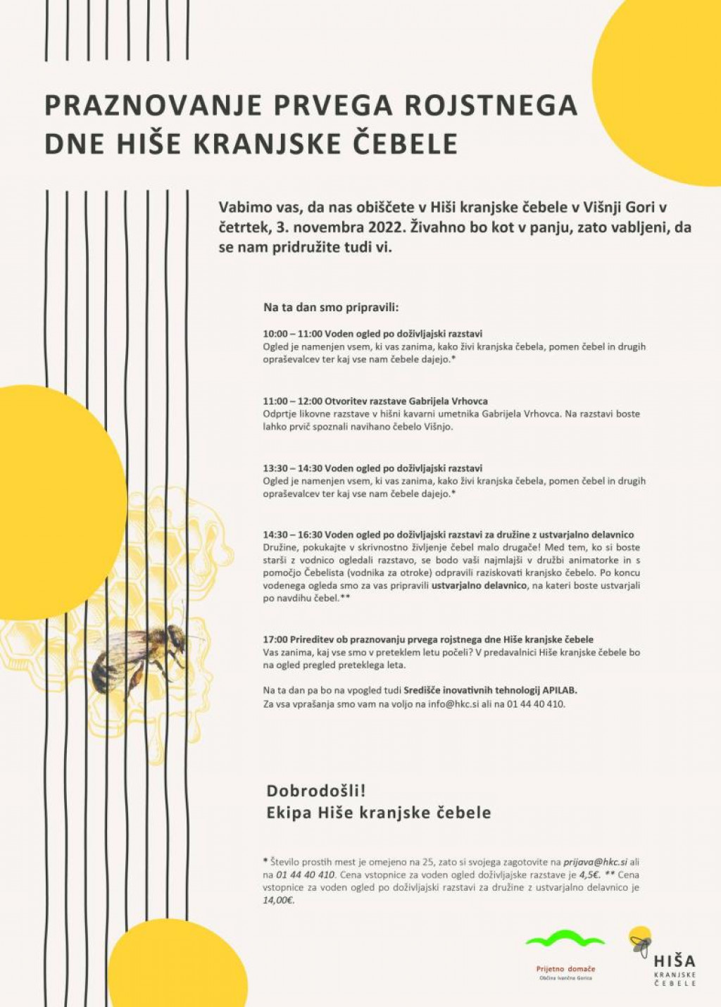 17:00 Prireditev ob praznovanju prvega rojstnega dne Hiše kranjske čebele
