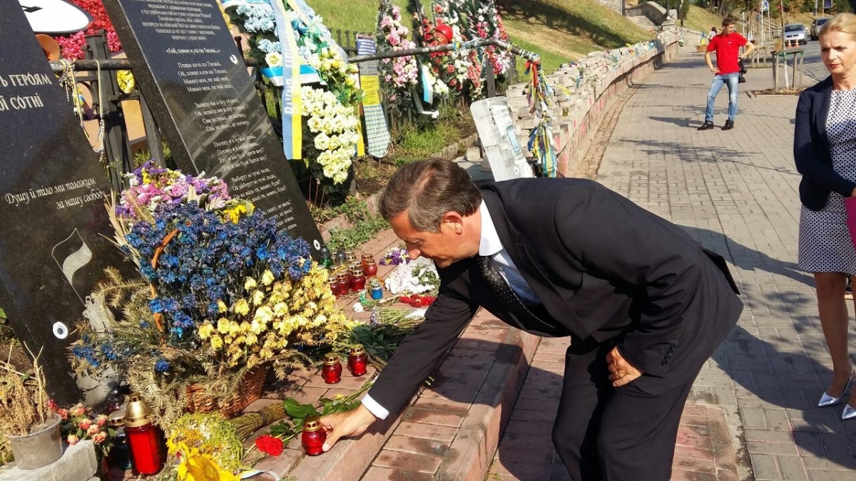 Erjavec je v okviru obiska v Kijevu na Trgu neodvisnosti prižgal svečo pred spominskim obeležjem žrtvam nasilja med lanskimi protivladnimi protesti. Foto: VKI