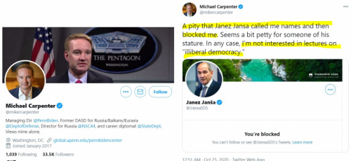 Michael Carpenter, ki na področju zunanje politike svetuje demokratskemu kandidatu na ameriških predsedniških volitvah Joeju Bidnu, je objavo slovenskega premierja Janeza Janše na Twitterju, v kateri izkazuje podporo Donaldu Trumpu, označil za "sramoto".