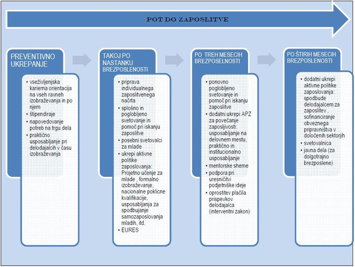 ..Vsaki mladi osebi med 15. in 29. letom starosti bo v štirih mesecih po prijavi v evidenco brezposelnih. ponujena zaposlitev ali usposabljanje na delovnem mestu, vključitev v formalno izobraževanje ali krajšo obliko institucionalnega ali praktičnega usposabljanja....