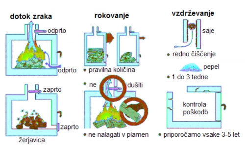 rumenkasto-rdečkast in živahen plamen je znak , da je količina zraka zadostna. Odprtine za zrak zaprite takoj, ko se neha tvoriti dim, na žerjavici pa so samo še kratki modri plamenčki. Novo gorivo nalagajte le na žerjavico. Kose lesa, ki niso zgoreli, potisnite v žerjavico, da bodo zgoreli pri visokih temperaturah.