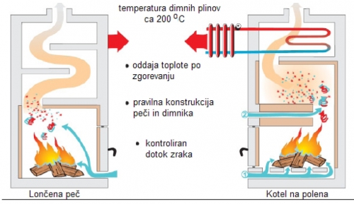 V nasprotju s tem pa je pri dobrem zgorevanju, t.j. suh les (vlažnost pribl. 15/18%) v pravilno velikih kosih, dosežena višja temperatura, emisij je manj, izkoristek pa višji.