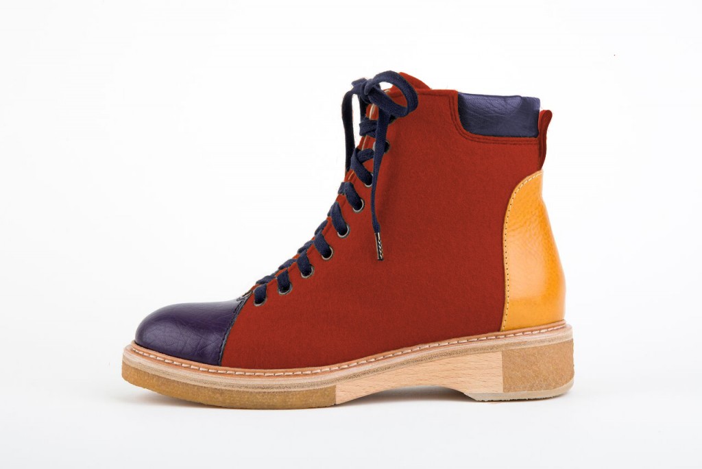 - zgornji sredinski del volneni filc v barvi manga, opetnik rumenkasto naravno strojeno gladko usnje, špica in podložena obroba nad gležnjem gladko naravno strojeno usnje v indigo barvi, notranja podloga naravno strojeno usnje natur,