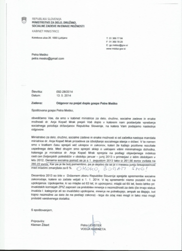 na razne naslove sem pisala o revščini v državi, med drugim tudi ministrici za delo, družino in socialne zadeve. Iz kabineta ministrice sem dobila odgovor, ki me je pošteno nasmejal ( v priponki). Sprašujem se, v kaki povezavi je revščina z inteligenco ? Ali res mislite, da ker smo revni, da ne znamo razmišljati in da smo bebci ?