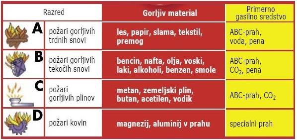 Glede na vrsto gorljivega materiala ločimo različne razrede požarov. Pomembno je vedeti kaj gori, da lahko pravilno in učinkovito ukrepamo ter izberemo primerno gasilno sredstvo. V gospodinjstvih so najprimernejši gasilniki na vodo ali ABC-prah.