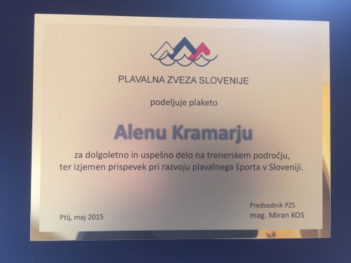 Na skupščini Plavalne zveze Slovenije, ki je potekala v Hotelu Primus na Ptuju, je bilo našemu trenerju Alenu Kramarju podeljena plaketa za dolgoletno in uspešno delo na trenerskem področju, ter izjemnemu prisoevku pri razvoju plavalnega športa v Sloveniji. Čestitamo.