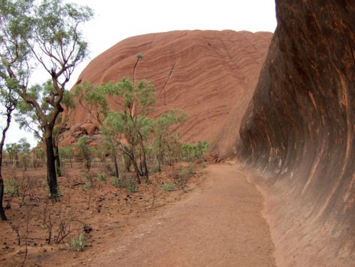 No, z otroki je vse skupaj malo drugače. Mi nismo trimčkali, smo pa hodili. Hodili smo več kot 3 ure in v tem času prehodili 3/4 poti. Za motivacijo smo si sproti izmišljali vse mogoče zgodbe o Uluru, da so tu živeli dinozavri, ki so v skali pustili svoje stopinje in teh “dinozavrovih stopinj” je bilo potem naenkrat ogromno. In tu ob poti rastejo tudi takšna čarobna drevesa, kjer, ko prideš do njega, zapreš oči in ti drevo v roko vrže vitaminski bonbonček. Seveda so ta drevesa zelo redka, toda ravno dovolj narazen in vedno tista največja, ki smo jih daleč naprej ob poti videli, da sta otroka v velikem pričakovanju hodila naprej in naprej… Ja, res smo se zabavali ob hoji in celo naš 3-letnik je sam prehodil več kot pol poti. Sama pa se nisem mogla načuditi, kako zelo strma je ta skala in to prav iz vseh strani. Tudi tam, kjer celo lahko splezaš gor (čeprav je spodaj velika tabla, kjer piše, da je to v nasprotju s prepričanjem aboriginov), je skoraj navpična. Šele zdaj razumem članke, kjer so pisali, da se je že zgodilo, da je kakšnega turista odpihnil sunek vetra, ko je plezal gor…