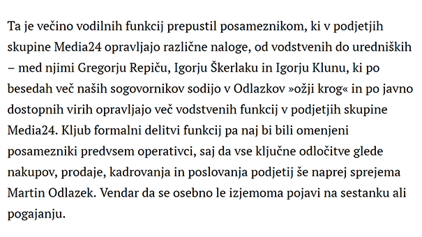 ... med drugim tudi direktor podjetja Kokos Agency, d. o. o. (ki ga lastniško seveda obvladuje Odlazek prek podjetja Media24), in tako prek Kokosa praktično tudi šef trženja portala Necenzurirano (vir). Kar posledično pomeni, da Odlazek v svojem značilnem slogu - da ga formalno kakor nikoli ni zraven, prek Igorja Kluna in financ upravlja tudi portal Necenzurirano, ki ga sicer uredniško uradno vodi novinar Primož Cirman.